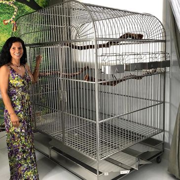 Some people might just consider these extra large indoor cages, but indoor aviaries are something we love and implement ourselves! They are meant to be large enough for the birds to be able to climb and fly and be the amazing birds that they are. This amazing stainless steel aviary was custom made for our friend and free flight student, Claudia, but you can get an indoor aviary online or from Corners Limited. Just be aware of all the items we mentioned in the traditional cage set up as those apply to indoor aviaries as well.